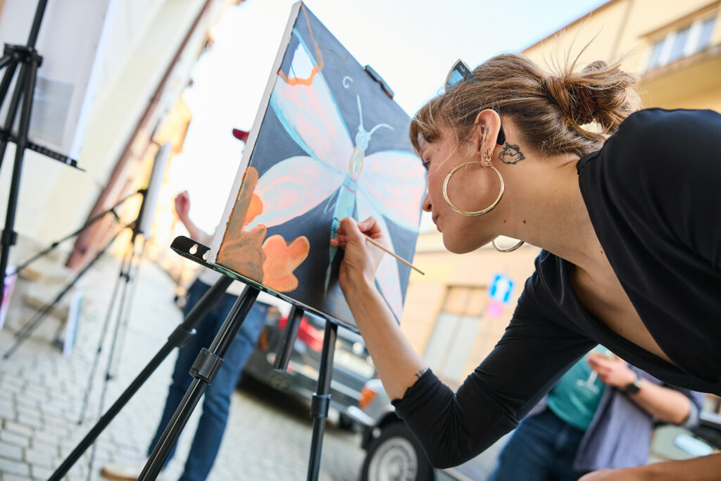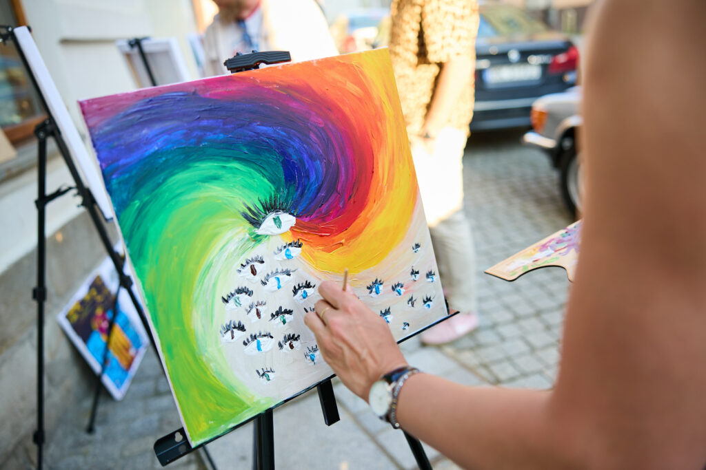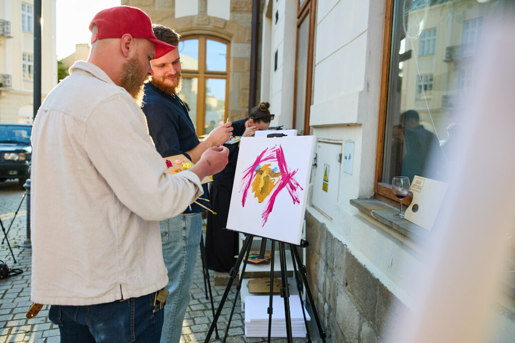 Warsztaty odbywają się w ciepłej, kameralnej atmosferze naszej galerii. To spotkanie, które bardziej przypomina chwilę z przyjaciółmi niż tradycyjne zajęcia. Każdy uczestnik otrzymuje pełen zestaw materiałów – podobrazia, farby, pędzle – a także kieliszek wina, który pomaga rozluźnić się i otworzyć na twórcze eksperymenty.